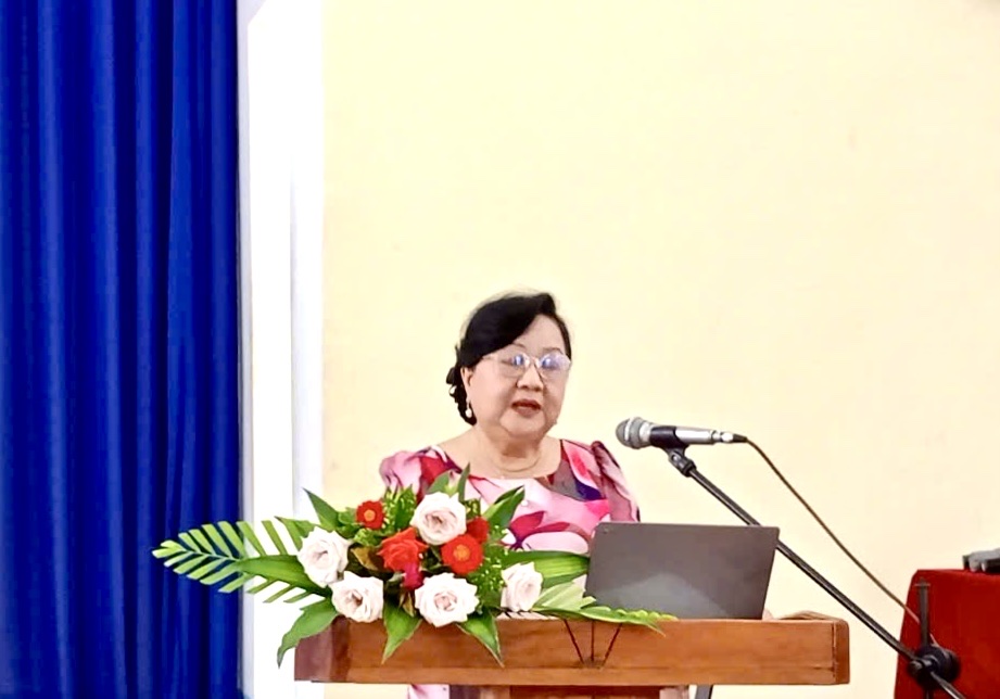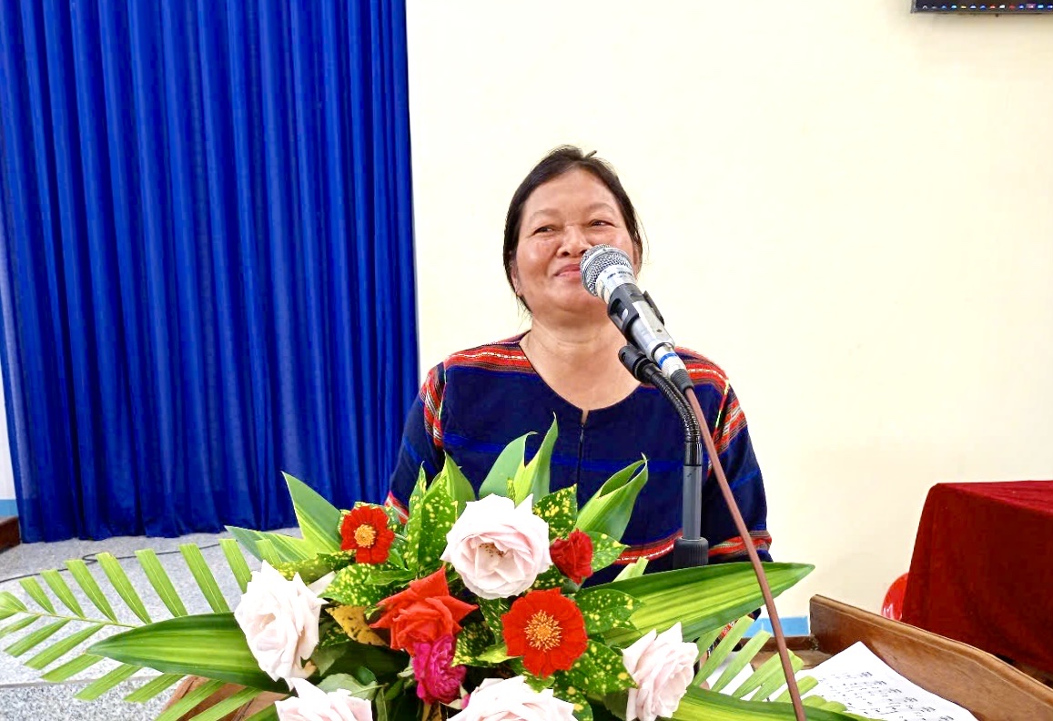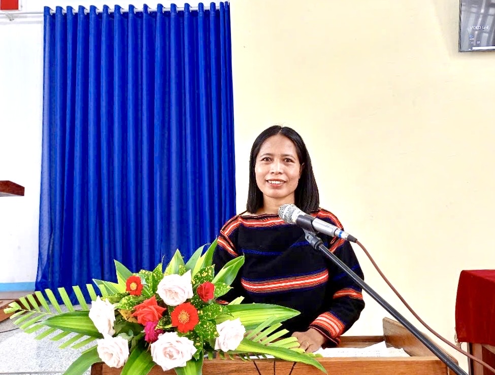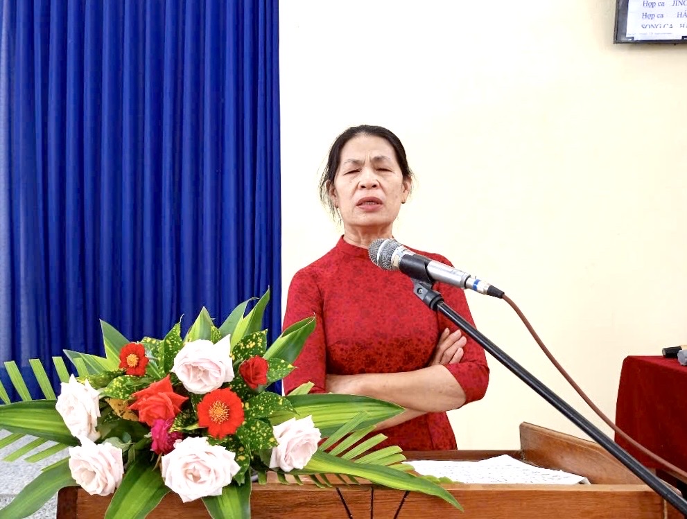 Cô Truyền đạo RCom H Tap làm chứng tóm tắt công việc Chúa qua Mục vụ Phụ nữ tỉnh Gia lai và cầu thay: Cảm ơn Chúa qua việc học lời Chúa Chúng tôi lấy Kinh thánh làm nền tảng trong đời sống gia đình.