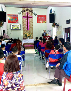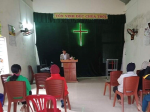 Do nhà Chúa tạm bợ chưa được xây dựng, nên các con cái Chúa ngồi ra đến ngoài sân để thờ phượng Chúa.