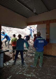 Hội Thánh Đắk Trấp giúp xúc dọn đất bị sạt lỡ sập tường nhà.