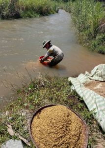 Bà con đi mót lại lúa bị lấp dưới bùn đem ra suối rửa.