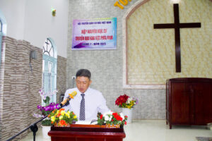 Mục sư Nguyễn Văn Quá (QN.HT Suối Kiết) Trưởng ban Hiệp Nguyện hướng dẫn buổi chiều