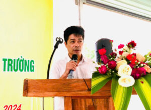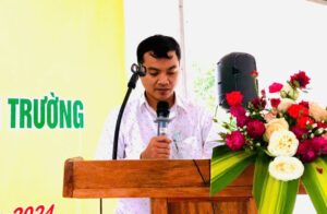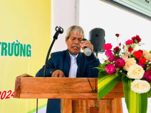 Ông Ksor Uyn. Chủ tịch UBMTTQVN xã Amarơn. Đọc tên đại diện bên Hội thánh, hộ gia đình, thôn Marin 3, lên ký kết để nhận 5 thùng c và trao 60 cây trồng.
