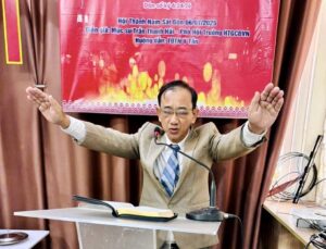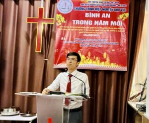 Mục sư Trần Thanh Hải dâng lời cảm tạ Chúa về một số công tác của Giáo hội và những nhu cầu cần cầu thay trong năm mới.