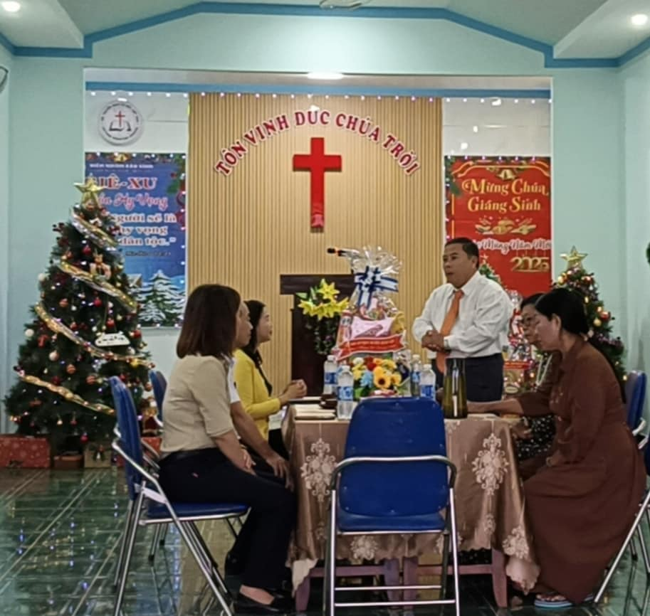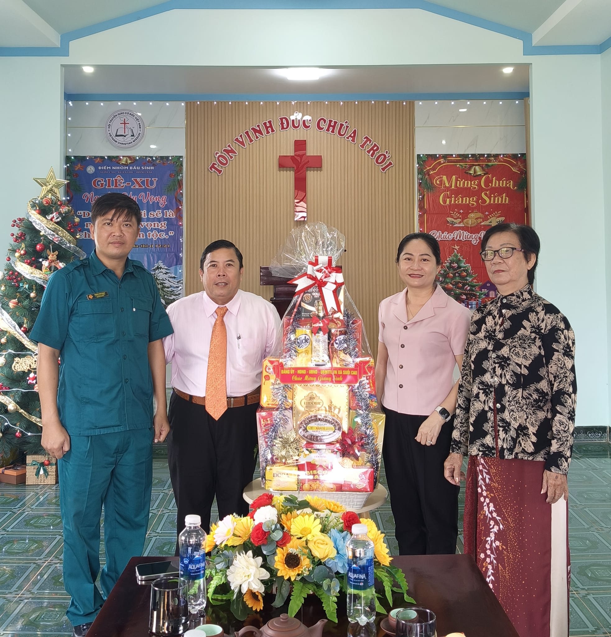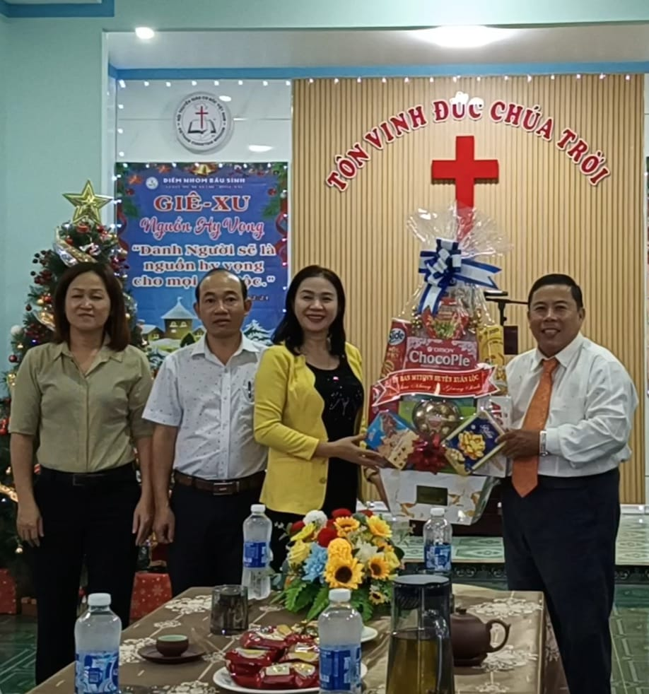 Trưởng đoàn Bà Ngô Thị Thùy Trang, Phó Chủ Tịch xã, và ông Trương Công Mạnh, cán bộ phụ trách công tác Tôn giáo. Đại diện đoàn, Bà Ngô Thị Thùy Trang đã trao tặng quà Chúc Mừng Giáng Sinh đến toàn thể tín hữu của Hội Thánh, qua đó gởi lời chúc Giáng Sinh an lành, tràn đầy niềm vui và phước hạnh đến toàn thể Tín hữu của Hội thánh.