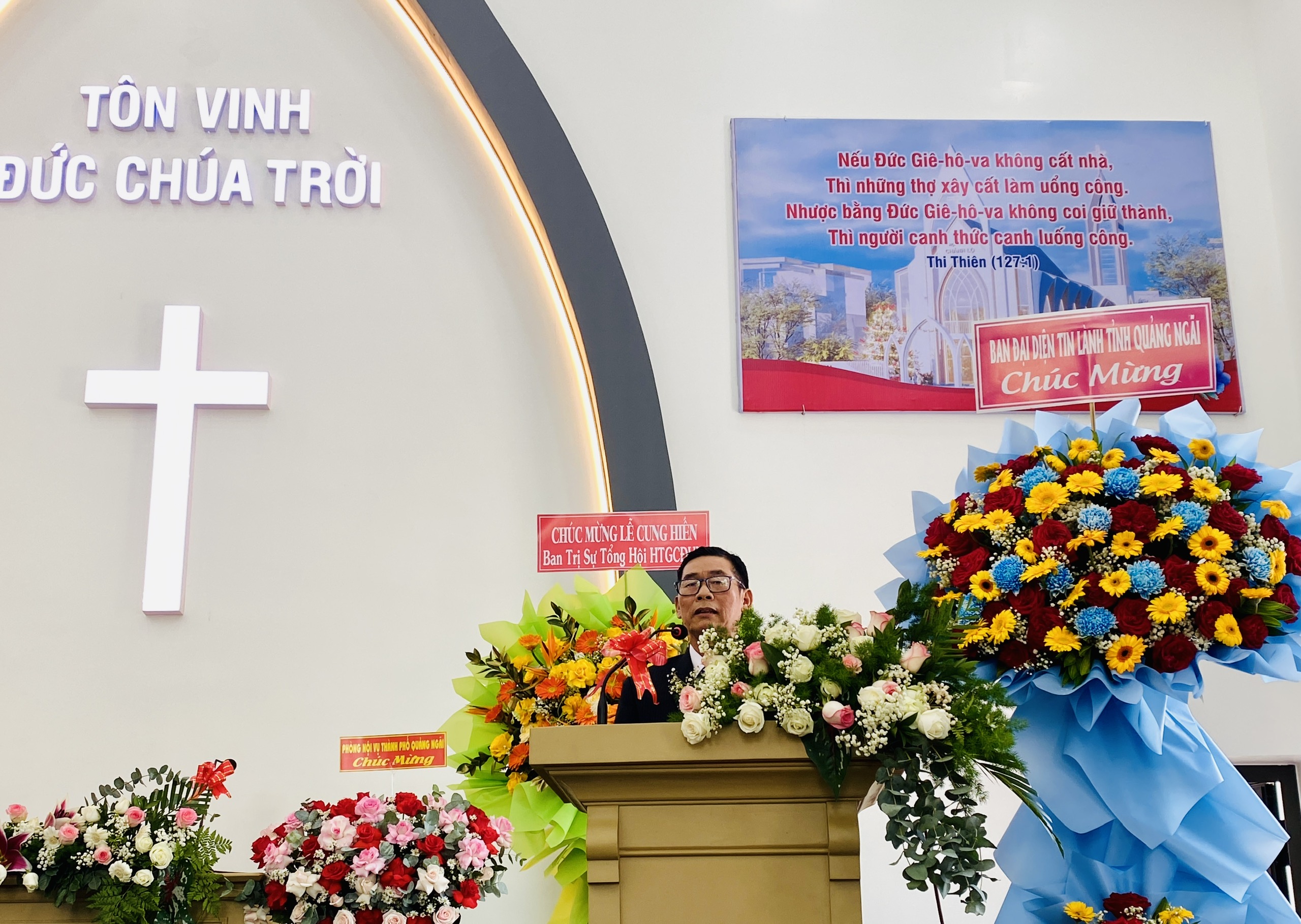 Về phía Giáo hội: Có sự hiện diện của Mục sư Nguyễn Quang Đức, Hội trưởng Hội Truyền Giáo Cơ Đốc Việt Nam (HTGCĐVN), cùng quý Mục sư trong Ban Trị sự Tổng hội; Mục sư Nguyễn Tợi, Nguyên Hội trưởng HTGCĐVN; Mục sư Trần Thảo, Nguyên Phó Hội trưởng HTGCĐVN; Quý Mục sư, Truyền đạo, Truyền đạo Tình nguyện cùng quý con cái Chúa xa gần, quý ân nhân; Quý khách mời đại diện các Hội thánh đồng tín lý trong khu vực tỉnh Quảng Ngãi tham dự.