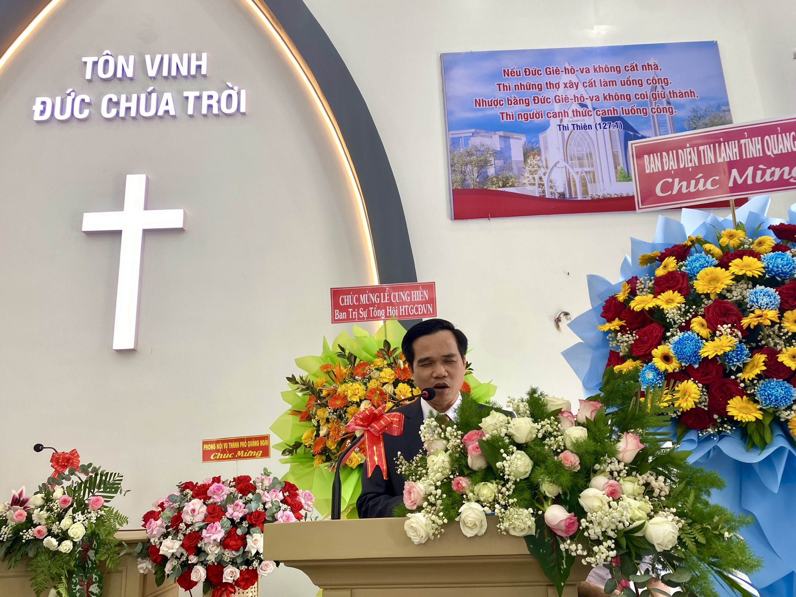 Sứ điệp Cung hiến qua Mục sư Nguyễn Quang Đức, dựa trên Kinh thánh Thi-thiên 127:1, “Nếu Đức Giê-hô-va không cất nhà, thì những thợ xây cất làm luống công. Nhược bằng Đức Giê-hô-va không coi giữ thành, thì người canh thức canh luống công.” để khích lệ tôi con Chúa, nhận biết sự tể trị của Ba Ngôi Đức Chúa Trời trong việc xây dựng, dù hoàn cảnh hay tiến trình xây dựng như thế nào, để mỗi con dân Chúa thấy được việc Chúa làm và thêm lòng trông cậy Chúa càng hơn.