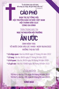 - Lễ Di Quan: Vào lúc 8h / 8/4/2022 Chủ lễ – Mục sư Nguyễn Quang Đức – Hội trưởng HTGCĐ VN. Hướng dẫn : Mục sư Nguyễn Khắc Xuân – UVBTSTH.
