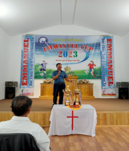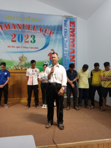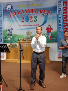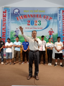 Mục sư Ân Ngọc Phỉ Túy (TBt ổ chức) tri ân các đội bóng tham dự EMMANUEL CUP 2023