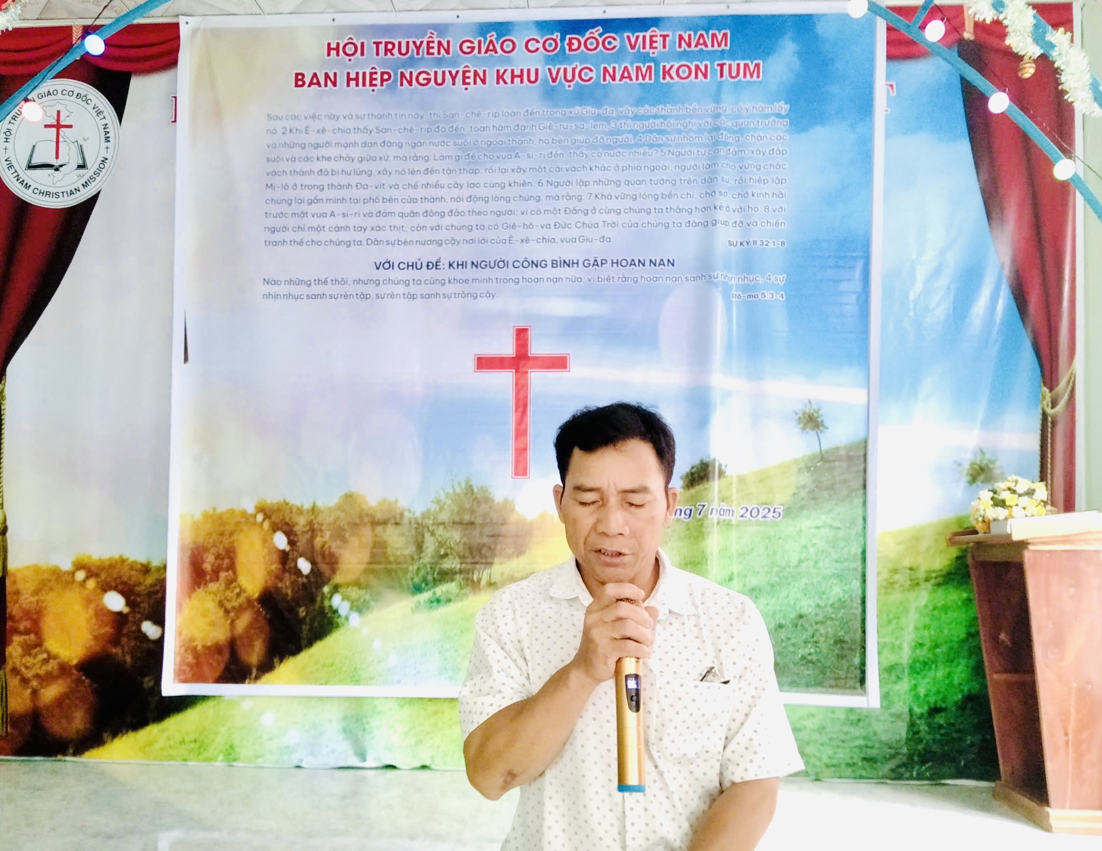 Mục sư Nguyễn Hữu Thành cầu nguyện cho Ban Điều hành Hiệp nguyện nam Kon Tum nhiệm kỳ 2025 – 2029