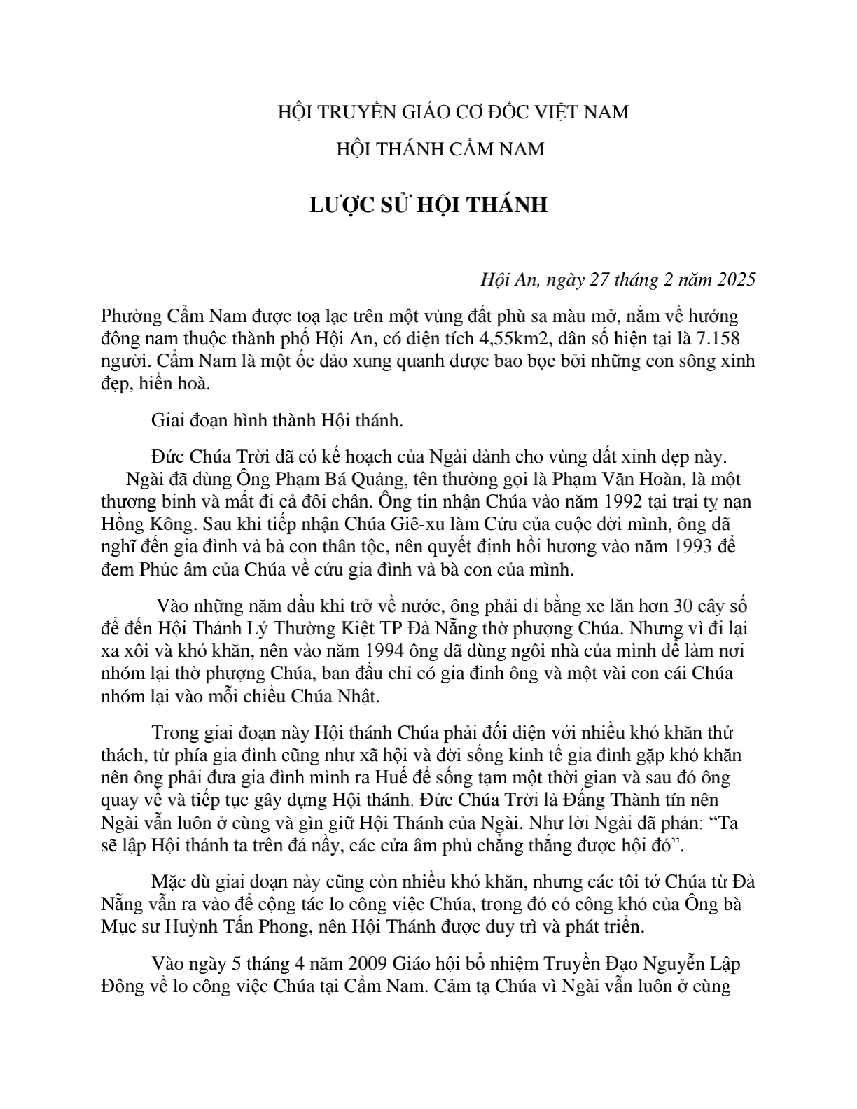 Vào lúc 9h00 ngày 27 tháng 2 năm 2025, tại Hội thánh Cẩm Nam đã tổ chức Lễ Công bố Quyết định thành lập Hội thánh, Bổ nhiệm Quản nhiệm và Cung hiến Nhà thờ tại tổ 18, khối Thanh Nam, phường Cẩm Nam, TP Hội An, tỉnh Quảng Nam.