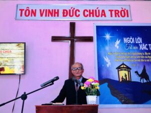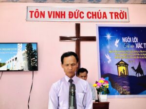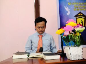 Truyền đạo Đinh Văn Kiêm, Quản nhiệm Hội thánh Trà Thủy, cầu nguyện dâng buổi Hiệp nguyện lên cho Ba Ngôi Đức Chúa Trời
