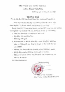 Home Thông báo Thông Báo Về Việc Tổ Chức Trại Bồi Linh Thanh Thiếu Niên...Thông báoThông Báo Về Việc Tổ Chức Trại Bồi Linh Thanh Thiếu Niên – 07/2024By Ban Biên Tập - 15 June, 20246210FacebookTwitterPinterestWhatsApp RELATED ARTICLESMORE FROM AUTHOR Thông báoThư Kêu Gọi Hướng Lòng Về Miền Bắc Trong Thiên Tai Bão Lụt Thông báoBiên Bản Số 11 TH/NK 2023-2027 Thông báoBiên Bản Số 10 TH/NK 2023-2027LEAVE A REPLY Cancel replyPlease enter your comment! Please enter your name here You have entered an incorrect email address!Please enter your email address here Save my name, email, and website in this browser for the next time I comment. Mạng xã hội22,952FansLike3,912FollowersFollow0SubscribersSubscribeBài viết mớiChúa Luôn Ở Cùng | Oneway Radio – Tĩnh Nguyện Hằng... Tĩnh Nguyện Hằng Ngày 23 October, 2023Sống Thỏa Vui Trong Chúa | Oneway Radio – Tĩnh Nguyện... Tĩnh Nguyện Hằng Ngày 30 June, 2023Động Chạm Tấm Lòng | Oneway Radio – Tĩnh Nguyện Hằng... Tĩnh Nguyện Hằng Ngày 21 August, 2024Con Ở Đâu? | Oneway Radio – Tĩnh Nguyện Hằng Ngày... Tĩnh Nguyện Hằng Ngày 28 April, 2025Tin tức mớiĐừng Bỏ Cuộc | Oneway Radio – Tĩnh Nguyện Hằng Ngày... Tĩnh Nguyện Hằng Ngày 3 November, 2024Xa Mặt Cách Lòng | Oneway Radio – Tĩnh Nguyện Hằng... Tĩnh Nguyện Hằng Ngày 30 October, 2023Sống Theo Đúng Mục Đích | Oneway Radio – Tĩnh Nguyện... Tĩnh Nguyện Hằng Ngày 1 July, 2022Sự Sống Mong Manh | Oneway Radio – Tĩnh Nguyện Hằng... Tĩnh Nguyện Hằng Ngày 26 October, 2024