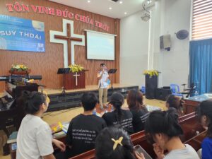 Nguyễn Thị Thùy Vi – Trưởng ban Thanh niên Hội thánh Phú Hòa hướng dẫn chương trình.